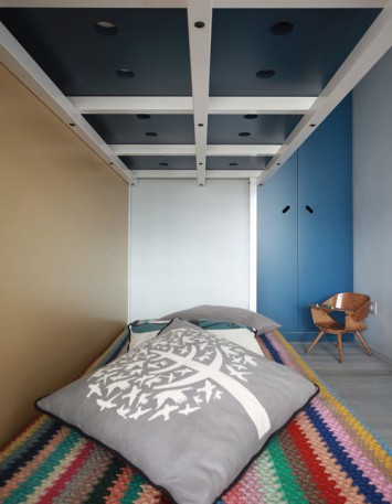 Fun House we Francji to pomysł na to, jak wydzielić przestrzeń w mieszkaniu, bez budowania ścian. Granatowo-beżowe kontsrukcje mają za...