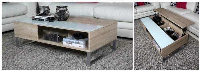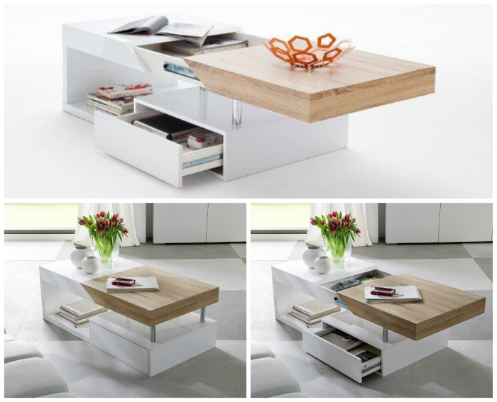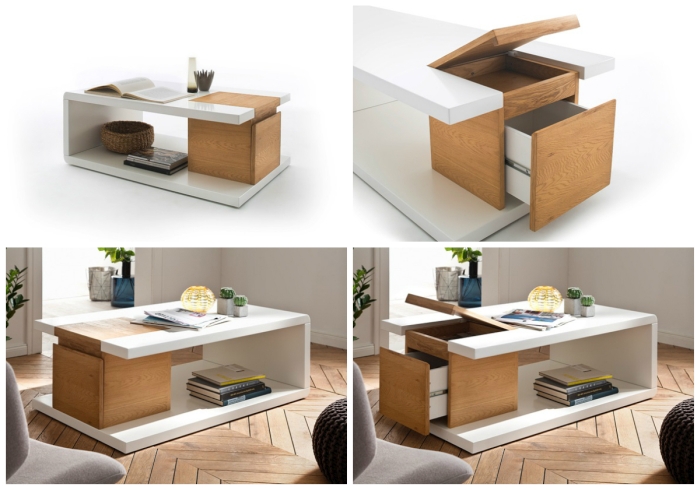 Meblem, którego nie ujęłam w kolażu, była właśnie powyższy projekt. To wielofunkcyjny stolik kawowy, który jednym ruchem możemy zamienić w wysoką ławę. Niezwykle funkcjonalne rozwiązanie pozwali nam wygodnie usiąść na sofie i pracować na kompie (yupi) czy nawet zjeść przy niej podwieczorek (wiem, powinno się jeść przy stole, ale kto nigdy nie zajadał się guacamole przed Grą o Tron, niech pierwszy rzuci czipsikiem).