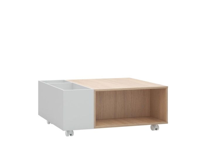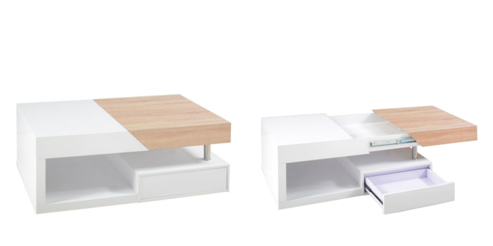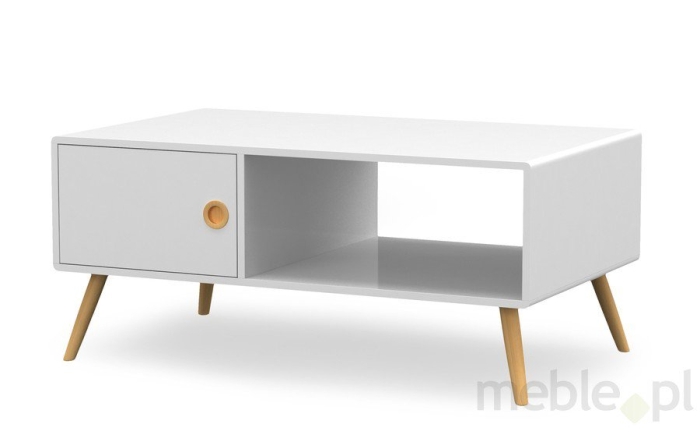 To stolik z nieco udziwnioną formą. Dwa drewniane kubiki zamknięte w białej podkowie, kryją w sobie całkiem ciekawe schowki. Do pierwszego dostaniemy się podnosząc drewniany blat, drugi zaś jest wysoką i głęboką szufladą na prowadnicach. Stolik wygląda bardzo nowocześnie, ale drewniane elementy dodają mu jakości i ciepła. Im dłużej mu się przyglądam, tym bardziej mi się podoba. Obawiałabym się tylko łatwego porysowania białej, lśniącej powierzchni blatu.